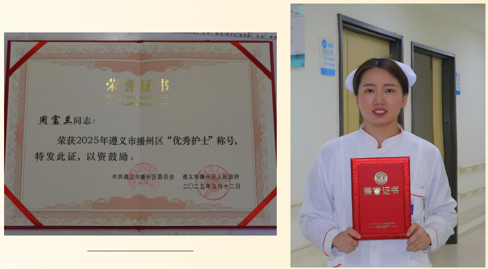 此次周富蘭榮獲播州區(qū) “優(yōu)秀護(hù)士” 稱號,不僅是對周富蘭個人專業(yè)素養(yǎng)與奉獻(xiàn)精神的高度認(rèn)可,更是遵義醫(yī)投康復(fù)醫(yī)院護(hù)理團(tuán)隊實力與擔(dān)當(dāng)?shù)纳鷦诱蔑@!